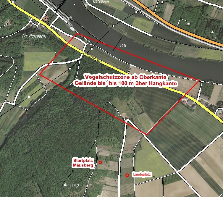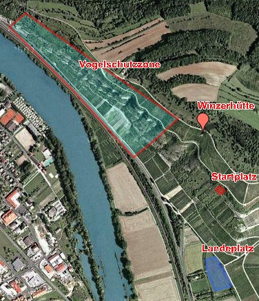 Die eingezeichnete Vogelschutzzone darf nicht beflogen werden. Bitte unbedingt beachten denn hier sind Uhu-Brutplätze und das Fluggebiet ist unter strenger Kontrolle der Naturschutzbehörde. Die Schutzzone beginnt am zweiten Felssporn nach der bewirtschafteten Winzerhütte ab Oberkante Gelände bis 100 m über Startplatzhöhe. Überflüge mit mehr als 100 m über Startplatz sind zulässig. Für den Flug ist ein Höhenmesser mit GPS mitzuführen und als IGC-Datei aufzuzeichnen. Die Flüge müssen als Nachweiß für die Naturschutzbehörde archiviert und auf Verlangen an den Verein übermittelt werden. Bei schwachen Soaringbedingungen sind maximal 4 Schirme gleichzeitig in der Luft zulässig.